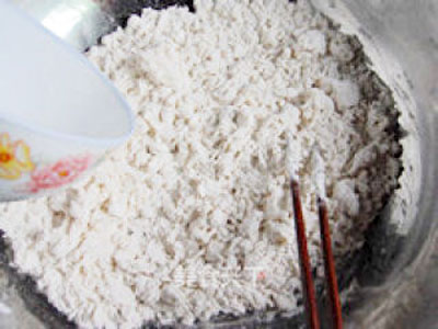 準(zhǔn)備一個不銹鋼盆放入500克面粉,將酵母倒進(jìn)30度左右的溫水里,用筷子攪拌融化,將酵母水倒入,邊倒入邊用筷子攪拌成絮狀。